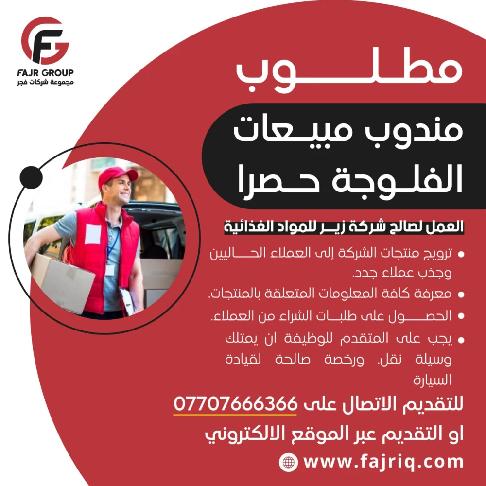 متطلبات الوظيفة : . مهارات الاتصال: أن يكون لدى المندوب مهارات اتصال ممتازة للتفاعل مع العملاء والترويج لمنتجات الشركة بشكل فعال. . مهارات المبيعات: يجب أن يكون لدى المندوب مهارات قوية في مجال المبيعات، بما في ذلك قدرة على إقناع العملاء وإدارة العلاقات الجيدة معهم. . قدرة العمل تحت الضغط: يجب أن يكون لدى المرشح القدرة على التعامل مع الضغوطات والعمل بكفاءة في بيئة ديناميكية. . القيادة والمهارات اللوجستية: يجب على المتقدم للوظيفة ان يمتلك وسيلة نقل. ورخصة صالحة لقيادة السيارة،ومهارات لوجستية جيدة. . المسؤولية والنزاهة: يجب أن يكون المندوب مسؤولاً وملتزماً بمواعيد التسليم ومعايير الجودة، ويجب أن يكون صادقاً ونزيهاً في التعامل مع العملاء. الالتزام بمواعيد العمل هو جزء أساسي من وظيفة المندوب و يجب على المندوب أن يكون حاضرًا في الوقت المحدد . مهام الوظيفة: . ترويج منتجات الشركة إلى العملاء الحاليين وجذب عملاء جدد. . معرفة كافة المعلومات المتعلقة بالمنتجات وتقديم شرح وافٍ عنها للعملاء. . الحصول على طلبات الشراء من العملاء. . التواصل الدائم مع الزبون والتعامل الجيد وتقديم المنتج بأفضل الطرق. . تغطية كافة الزبائن على امتداد المنطقة الجغرافية التي يعمل بها المندوب. . تحصيل مستحقات الشركة عند العملاء دون تأخير. . تقديم تقارير منتظمة عن المنافسة في السوق من حيث الأسعار والعروض والمنتجات الجديدة والدعاية والإعلان، أو توقف بعض الزبائن عن التعامل مع منتجات الشركة. . متابعة رفوف منتجات الشركة داخل المحال "الماركتات" وابراز مكانها بين منتجات الشركات الاخرى. الذهاب لاي مكان يقرره مشرف المبيعات من اجل فتح اكثر عدد ممكن من نقاط البيع